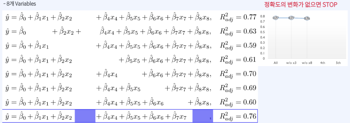 : 처음에는 모든 variables을 사용하고, 정확도에 영향을 미치지 않는 불필요한 variable을 sequentially 제거함