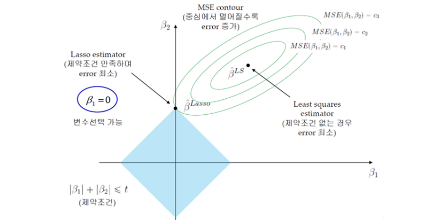 : Error를 Minimize하는 제약 조건에서는 필요 없는 Feature의 β(계수)에 Penalty를 부여함
