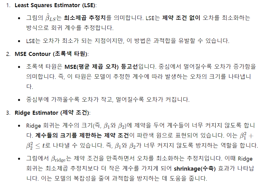 이 그림은 Ridge 회귀 분석을 설명하는 그림입니다. Ridge 회귀는 회귀 분석에서 **과적합(overfitting)**을 방지하기 위해 사용되는 기법입니다. 여기서 과적합은 모델이 학습 데이터에 너무 맞춰져서 새로운 데이터에 대한 일반화 성능이 떨어지는 경우를 말합니다.