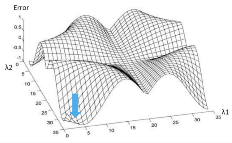 일정 범위 내로 λ1, λ2를 조정하여 가장 좋은 예측 결과를 보이는 λ1, λ2를 선정함