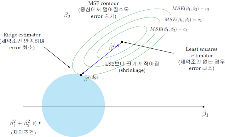 : Ridge Estimator와 MSE Contour가 만나는 점이 제약 조건을 만족하며 Error가 최소가 됨