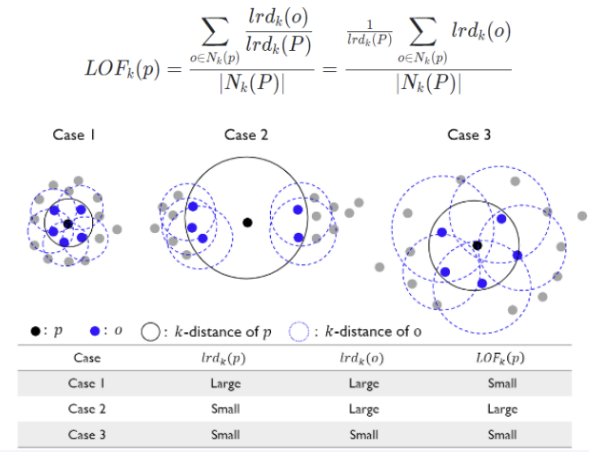 관측치 p의 이상치 정도를 나타내는 LOF는 p의 밀도와 이웃 o의 밀도의 비율을 평균한 것
