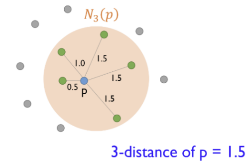 - k-distance of an object p: k-distance(p) 관측치 p와 k번째로 가까운 이웃의 거리