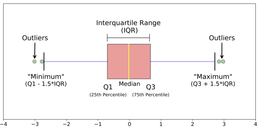 Box plot은 최소 정상 값 (min), 1사분위수 (Q1), 중앙값, 3사분위수(Q3), 최대 정상 값(max)를 나타내는 시각화 방법