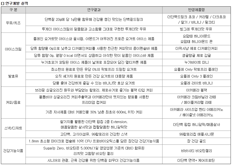 당사의 주요 제품으로는 단지형 용기로 유명한 국내 No.1 가공유 '바나나맛우유', 떠먹는 요거트의 대명사인 대한민국 1등 유산균 발효유 '요플레', 국내 최초로 원유를 사용한 카톤 아이스크림 '투게더', 엄선된 원두와 함께 프렌치 로스팅으로 향이 풍부한 프리미엄 커피음료 '아카페라', 천연 과일의 맛을 살린 프리미엄 냉장주스 '따옴' 등이 있으며, 종속회사인 해태아이스크림㈜의 주요 제품으로는 국내 최초의 콘 아이스크림 '부라보콘' 등이 있습니다. 당사의 해외 소재 종속회사인 BC F&B Shanghai Co., Ltd., BC F&B USA Corp., BC F&B Vietnam Co., Ltd.는 식품의 수입, 수출, 유통등을 주된 영업목적으로 하고 있습니다.