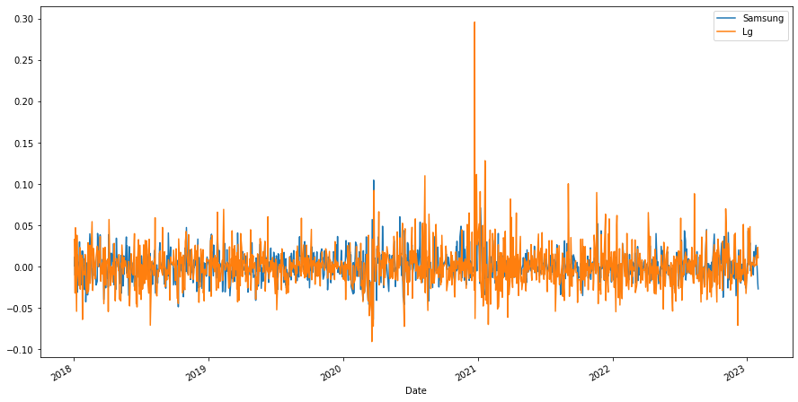 데이터프레임을 만들고 각 회사의 '변화'추이를 plot으로 그려 확인한다