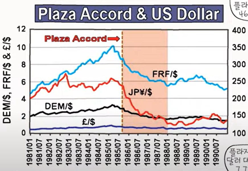 달럴-엔 환율의 역사(1) 세계 기축통화인 미국 달러와 주요 경제국 일본 엔화의 환율은 국제 정세 및 경제 상황과 맞물려 급변하는 역사를 겪었다. 2차대전 패전 이후인 1949년 4월 브레튼우즈 협정과 물가 안정의 필요성에 따라 일본에도 고정환율제가 도입당시 고정환율은 달러당 360엔고정환율제가 외환시장의 수급에 적절히 대응하지 못한다는 지적이 이어지자 변동환율제가 세계적 추세로 바뀌었고 일본도 1973년 2월 이를 도입 1985년 9월 '플라자 합의'는 커다란 전환점달러화 강세로 무역적자가 심해지자 다급해진 미국은 일본과 프랑스, 독일, 영국에 환율 조정을 강하게 요청해 플라자 합의를 이끌어냈다. 결국 당시 달러당 240엔대였던 엔화는 2년여 만인 1988년 120엔대로 두 배 가량 절상일본은 엔고 연..